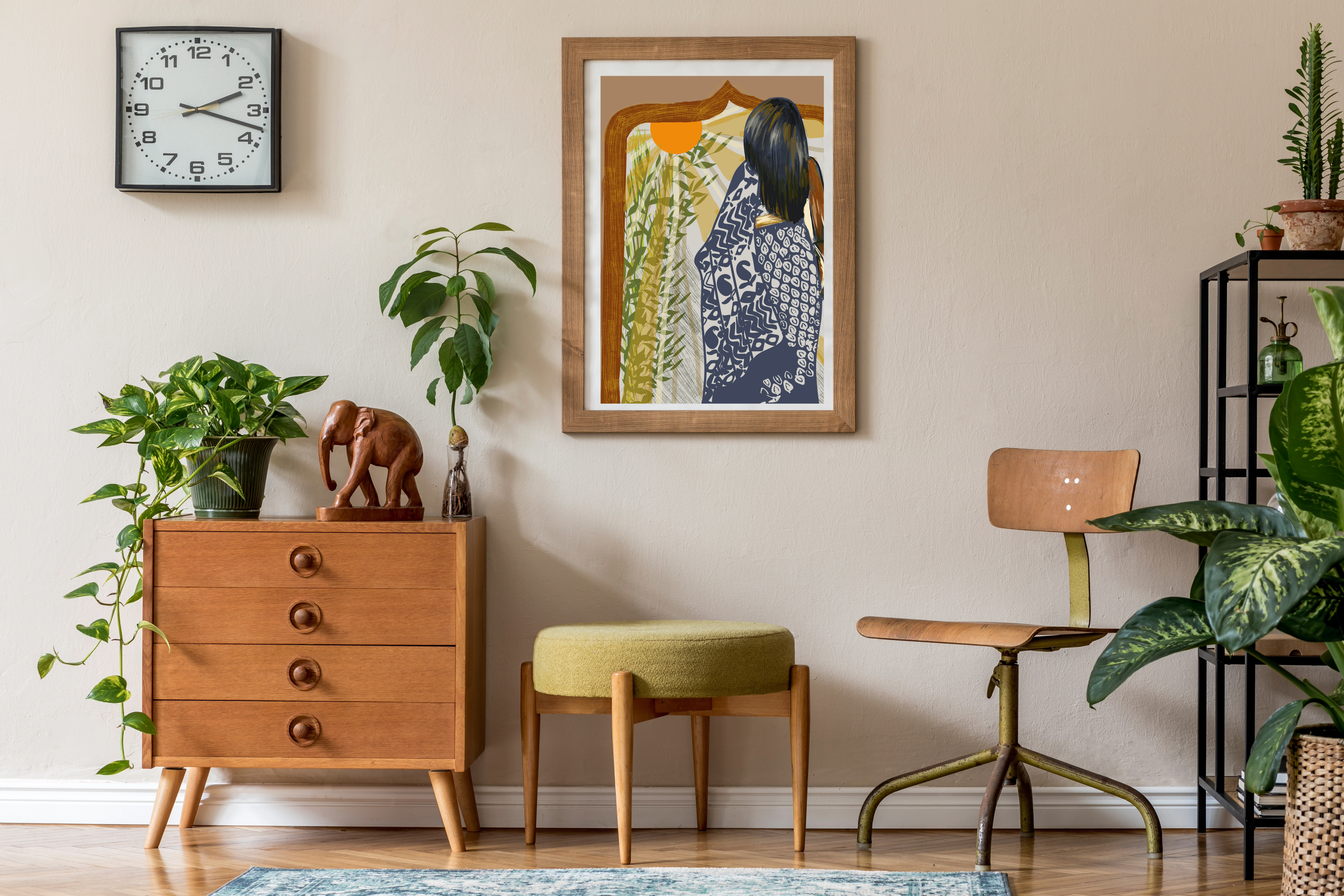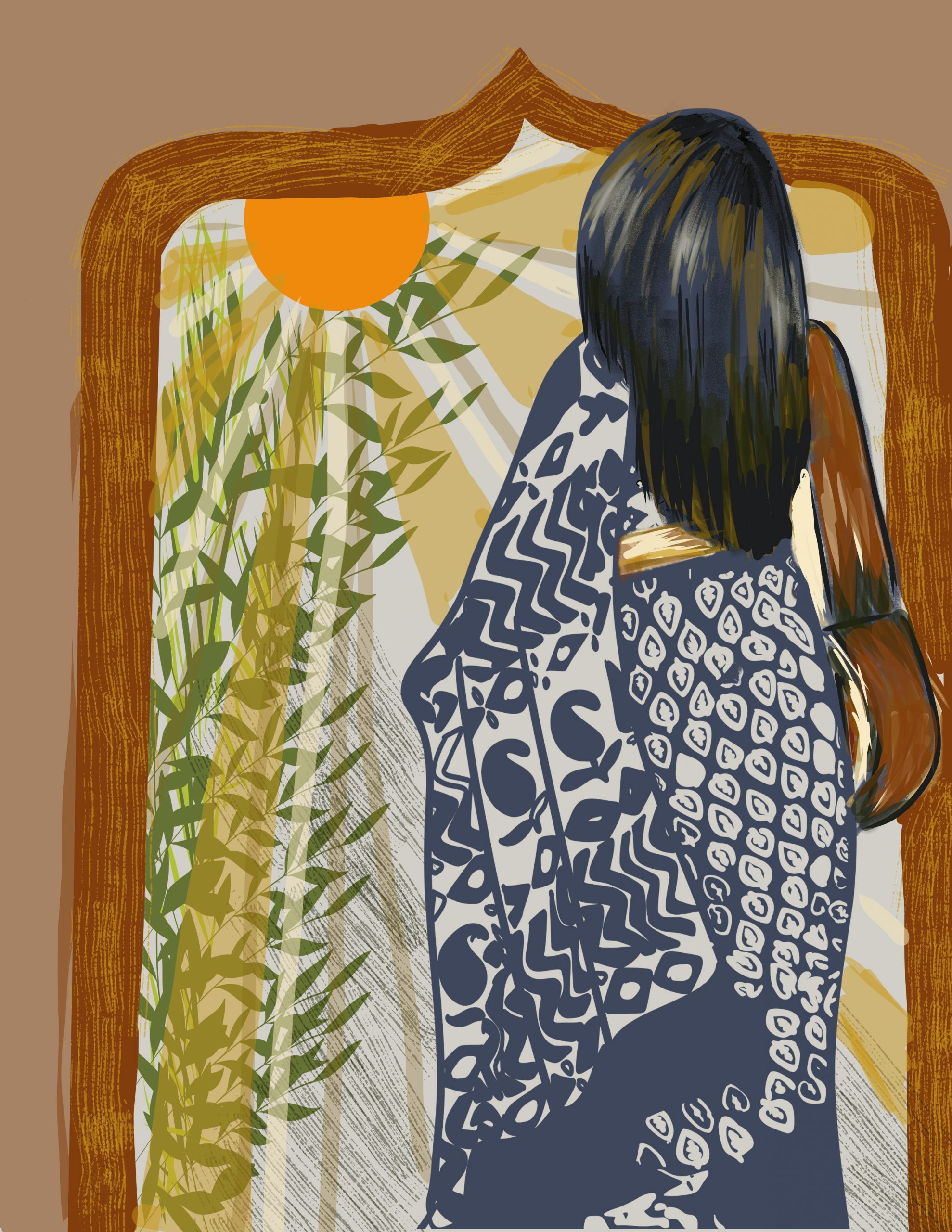 “Morning in the Mughal Garden” is a captivating artwork that captures the serenity of a South Asian morning. The figure, draped in intricate patterns inspired by traditional textiles, stands bathed in the soft glow of the rising sun. Surrounded by lush greenery and framed by an ornate arch, this piece evokes the timeless elegance of Mughal gardens, where nature, culture, and tranquility merge in perfect harmony. The warm, earthy tones and vibrant sunlight reflect a peaceful start to the day, celebrating the beauty of South Asian heritage and artistic tradition.