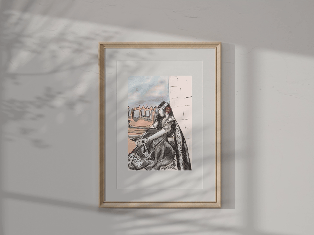 This evocative artwork, “Whispers of the Fort,” captures the quiet introspection of a woman seated against an ancient stone wall, her gaze distant as she is absorbed in thought. The backdrop of a regal fort, rendered in warm tones, hints at the grandeur of South Asian architectural heritage. A single red flower tucked into her hair adds a vibrant touch to the otherwise muted palette, symbolizing both beauty and resilience. The flowing lines of her traditional attire, adorned with intricate patterns, emphasize a connection to cultural identity, while the soft, dreamy sky above suggests a sense of tranquility and reflection. This watercolor painting beautifully merges tradition and introspection, offering a glimpse into a moment of serene contemplation.