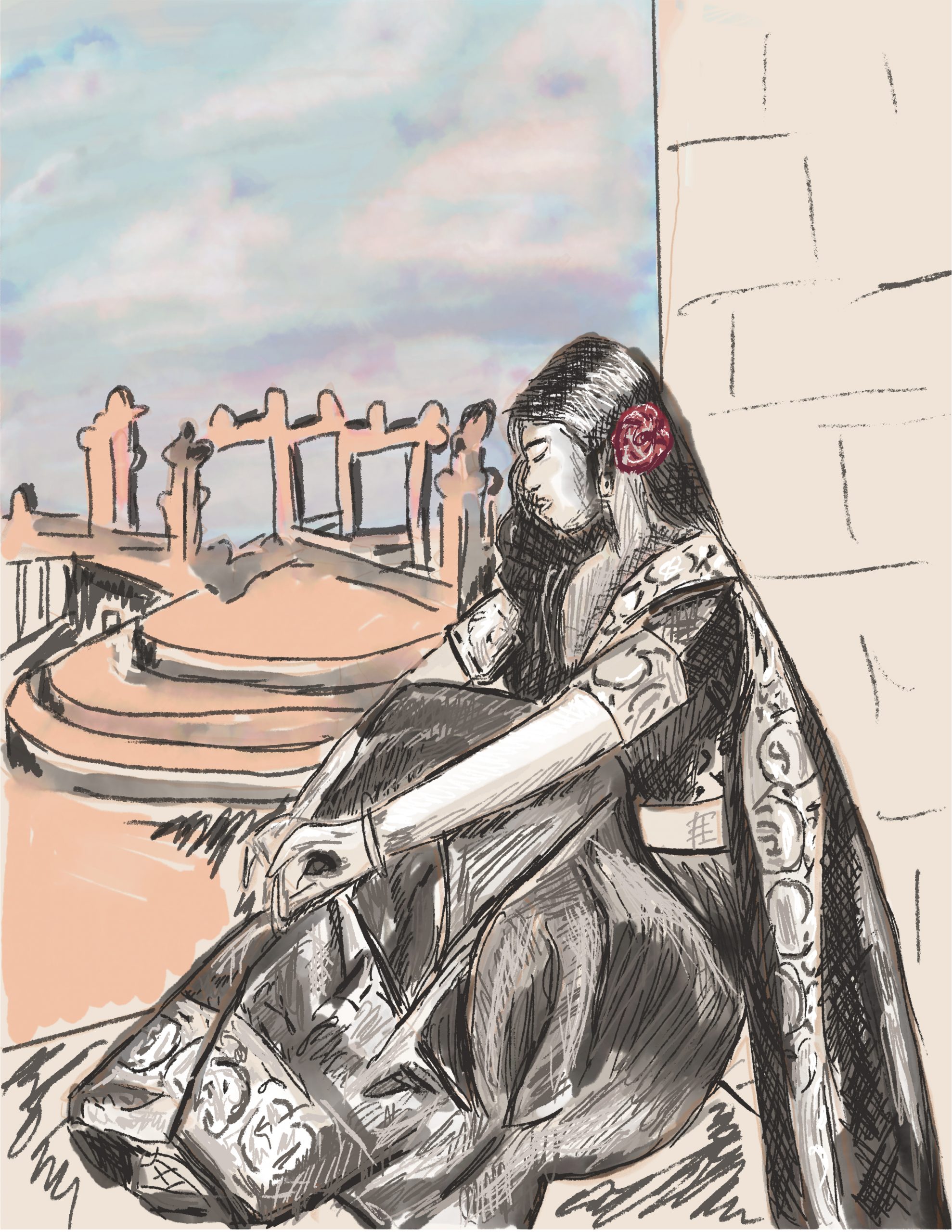 “Whispers of the Fort,” captures the quiet introspection of a woman seated against an ancient stone wall, her gaze distant as she is absorbed in thought.